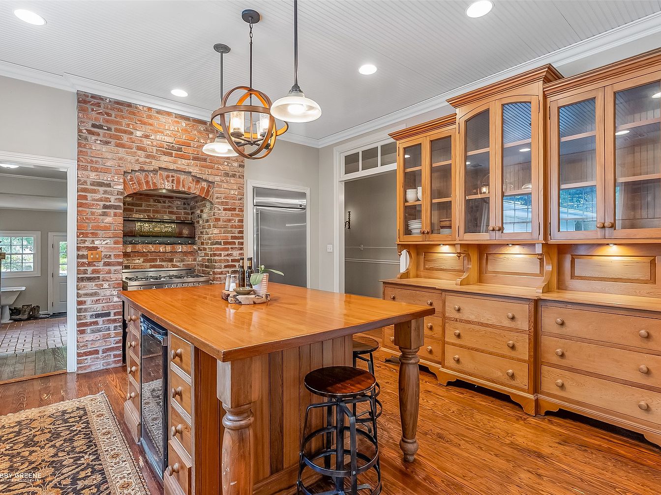 This kitchen combines rustic charm with modern functionality. A large wooden island, featuring a rich honey tone, stands at the center with decorative detailing on its legs. Behind it, a stunning exposed brick wall showcases a vintage-style arch, adding character. Sleek stainless steel appliances contrast with the warm wood cabinetry, which features glass-fronted upper sections to display dishware. Pendant lights with an industrial flair hang above the island, illuminating the space. The floor is adorned with dark hardwood, accented by a patterned area rug that enhances the cozy atmosphere, seamlessly blending historical and contemporary design elements.