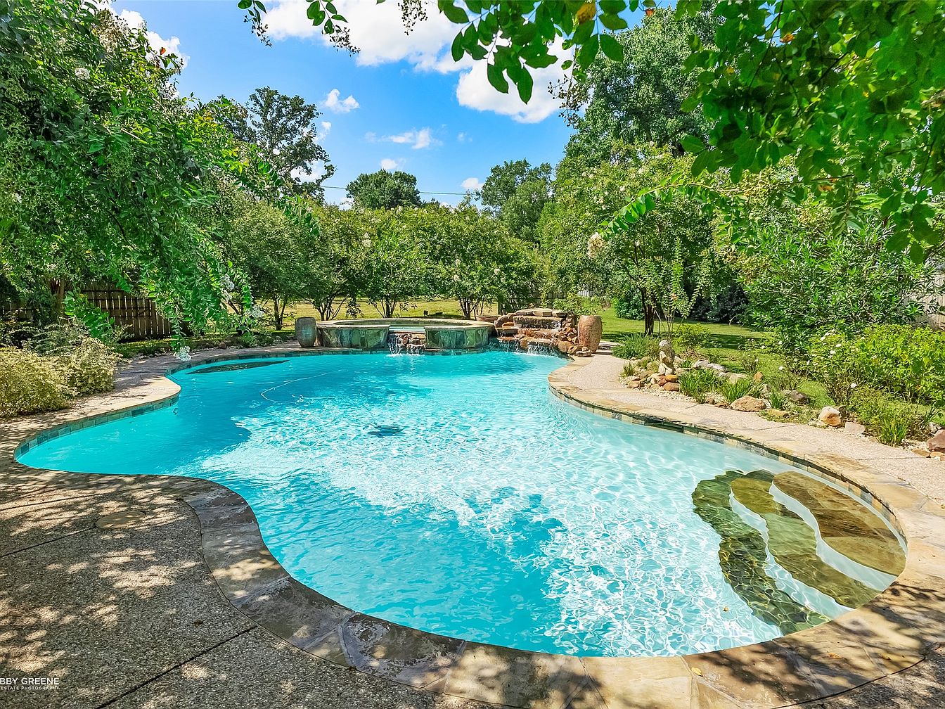 A refreshing backyard pool features a freeform design, seamlessly integrating with the surrounding lush greenery. The crystal-clear water glistens under the sunlight, inviting leisurely swims. A natural stone waterfall cascades gently into the pool, enhancing the tranquil atmosphere. The textured concrete patio is bordered by an assortment of vibrant plants and trees, creating a serene retreat. Sunlight plays through the leaves, casting dappled shadows on the water’s surface. The subtle earth tones of the pool edging complement the vibrant green landscape, establishing a harmonious balance between water and nature, perfect for relaxation and outdoor gatherings.