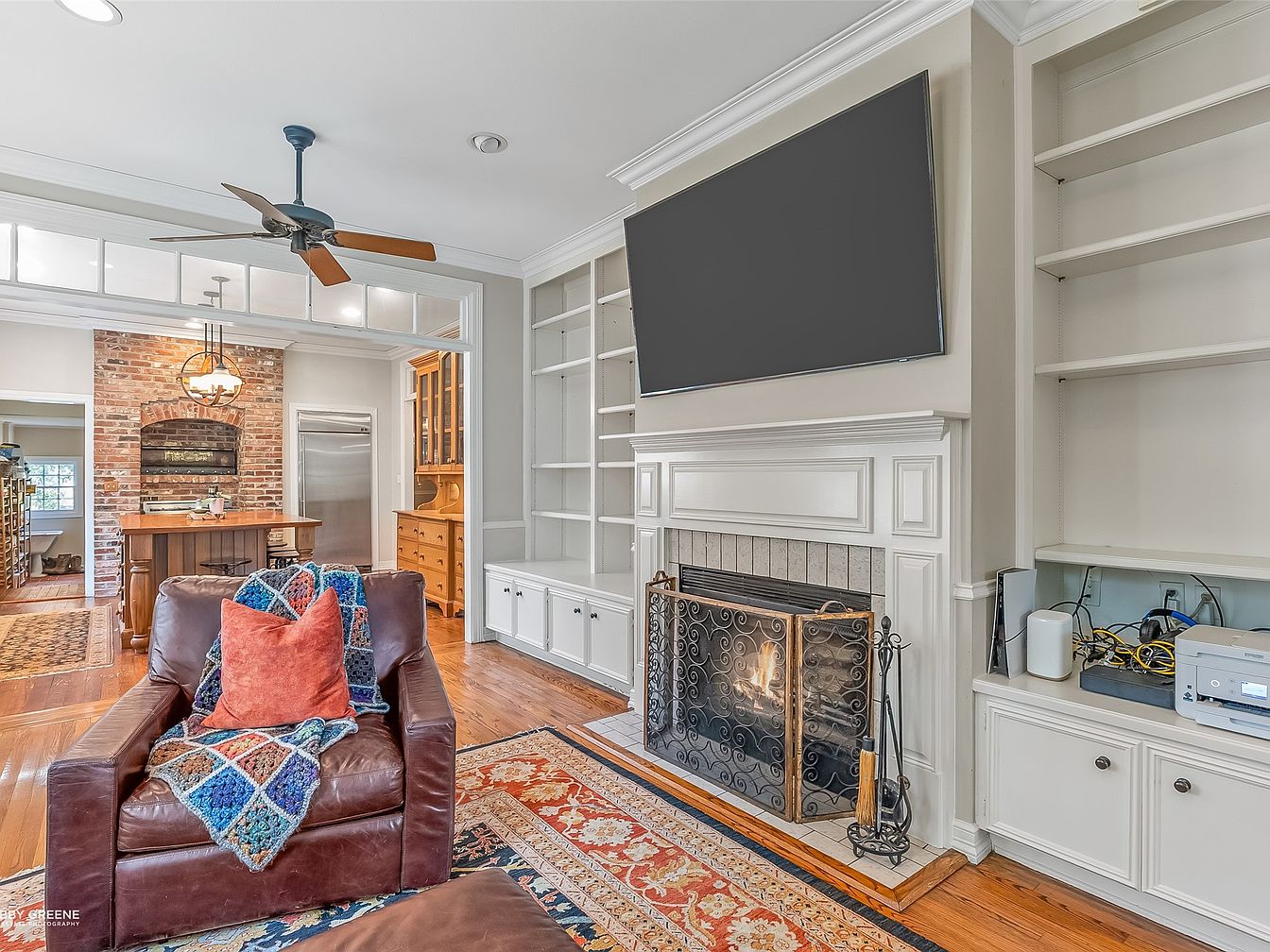 A cozy living room features a rich brown leather armchair adorned with colorful throw pillows and a knitted blanket. The space is anchored by a decorative area rug, showcasing intricate patterns in vibrant hues. A large flat-screen TV is mounted above a traditional white fireplace, which is framed with elegant molding and topped with a decorative screen. Exposed brick walls create a rustic charm, complemented by a stylish chandelier visible through an open archway leading to the kitchen. Built-in shelves flank the fireplace, adding functional storage, while warm hardwood floors enhance the inviting atmosphere.
