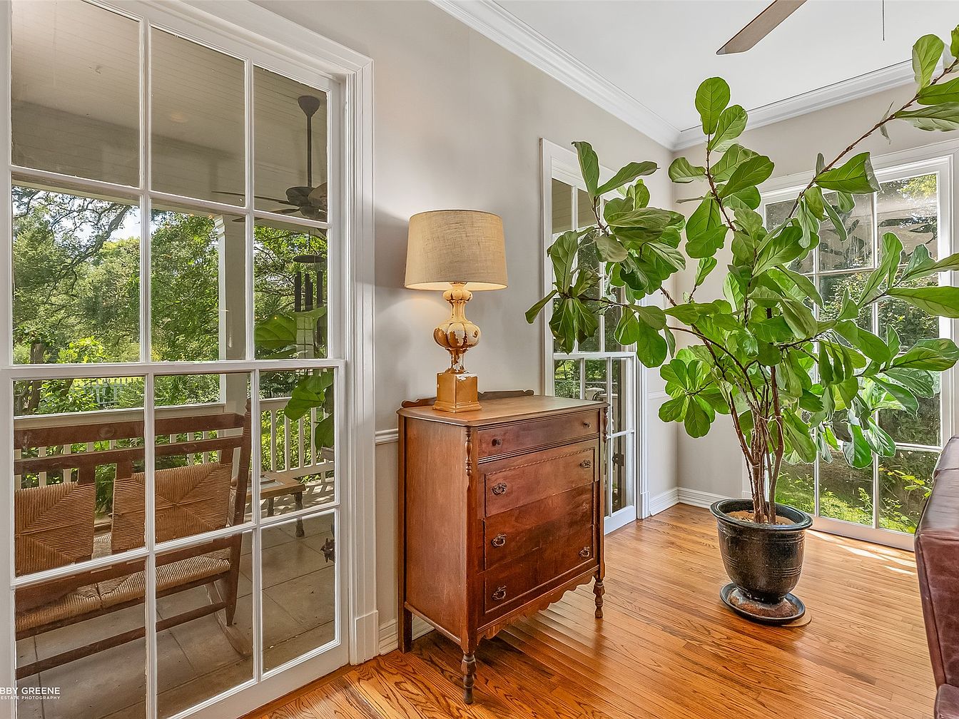 This sunroom features large, multi-pane windows that invite abundant natural light, framing the lush greenery outside. A beautiful wooden floor adds warmth, complementing a rich, antique chest of drawers made from dark wood, enhancing the space’s vintage charm. A chic lamp sits atop, casting a soft glow. In one corner, a vibrant potted fiddle leaf fig tree stands prominently, its broad leaves bringing a touch of nature indoors. The walls are painted in a soft hue, providing a serene backdrop, while elegant crown molding adds a refined architectural touch, emphasizing the sunroom’s inviting atmosphere.