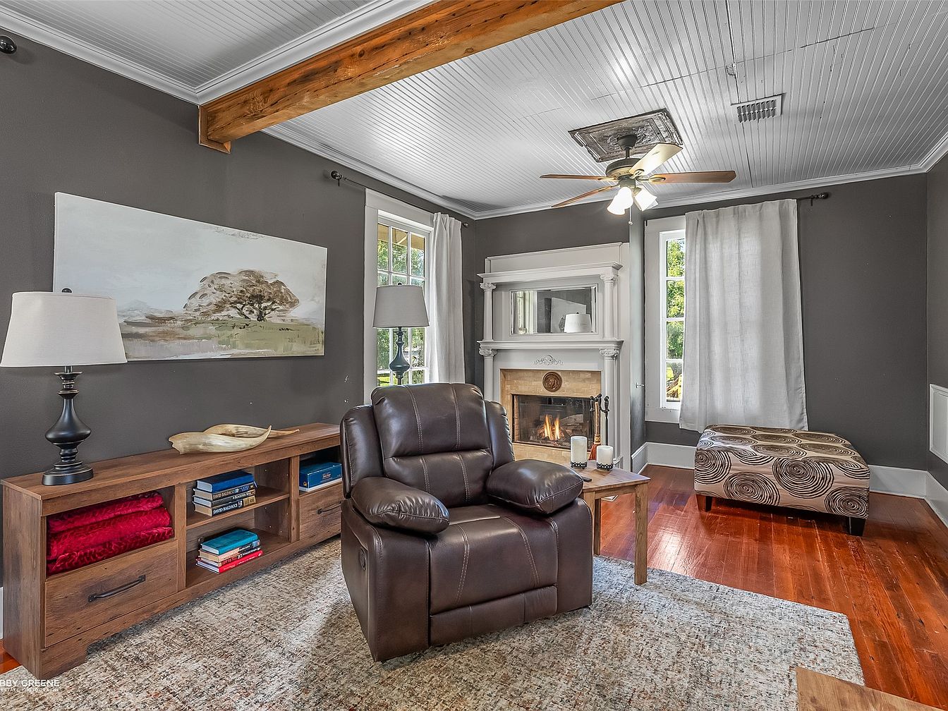 This cozy living room features a rich color scheme with dark gray walls, accentuated by a warm wooden beam across the ceiling. A plush brown recliner invites relaxation beside a wooden coffee table. A low-lying cabinet displays neatly stacked books and soft red blankets, adding warmth. A triptych painting of a tree enhances the wall opposite the stylish white fireplace, which serves as a focal point with its elegant mantel and intricate detailing. Natural light streams through large windows framed by sheer white curtains, while a circular ottoman with an abstract pattern adds a modern touch to the classic aesthetic.