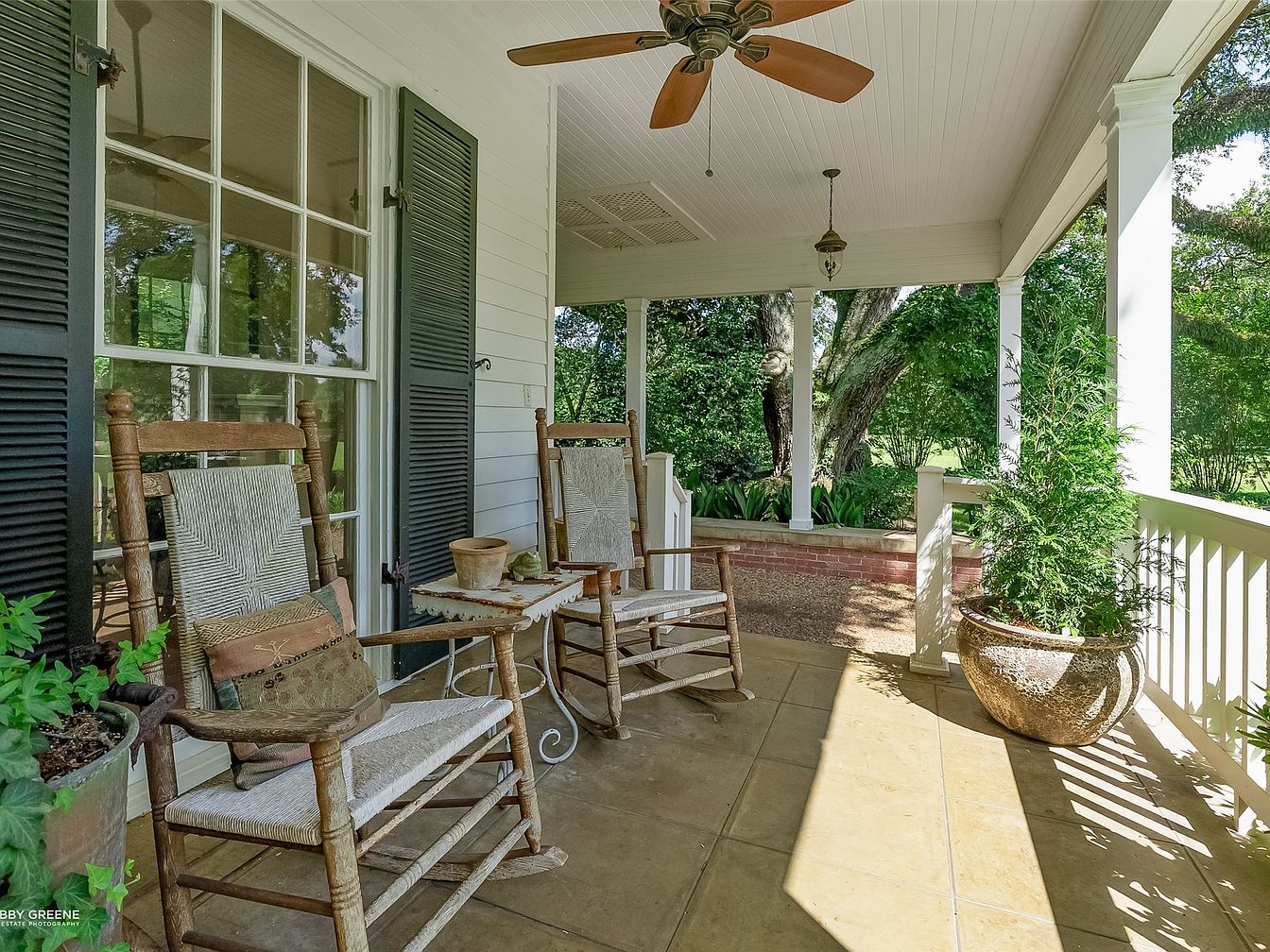 This inviting front porch features two rustic rocking chairs with woven seats, positioned to encourage relaxation. A small, decorative table, adorned with a potted plant, sits between them, enhancing the cozy atmosphere. The color palette consists of soft whites and earthy tones, with the white railings and siding contrasted by dark green shutters. A ceiling fan hangs above, providing comfort on warm days. Lush greenery and well-maintained garden beds surround the space, adding natural beauty. Textured tile flooring complements the rustic charm, while sunlight filters gently through the trees, creating a serene ambiance.